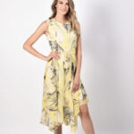 Beautiful Frank Lyman dress in a gorgeous yellow with a black abstract print on the front and black. The dress is designed in a sleeveless style with a round neckline, tie belt at the waist and a beautiful asymmetrical flowing skirt. There is a concealed zip fastener at the back and the dress is 3/4 lined.
