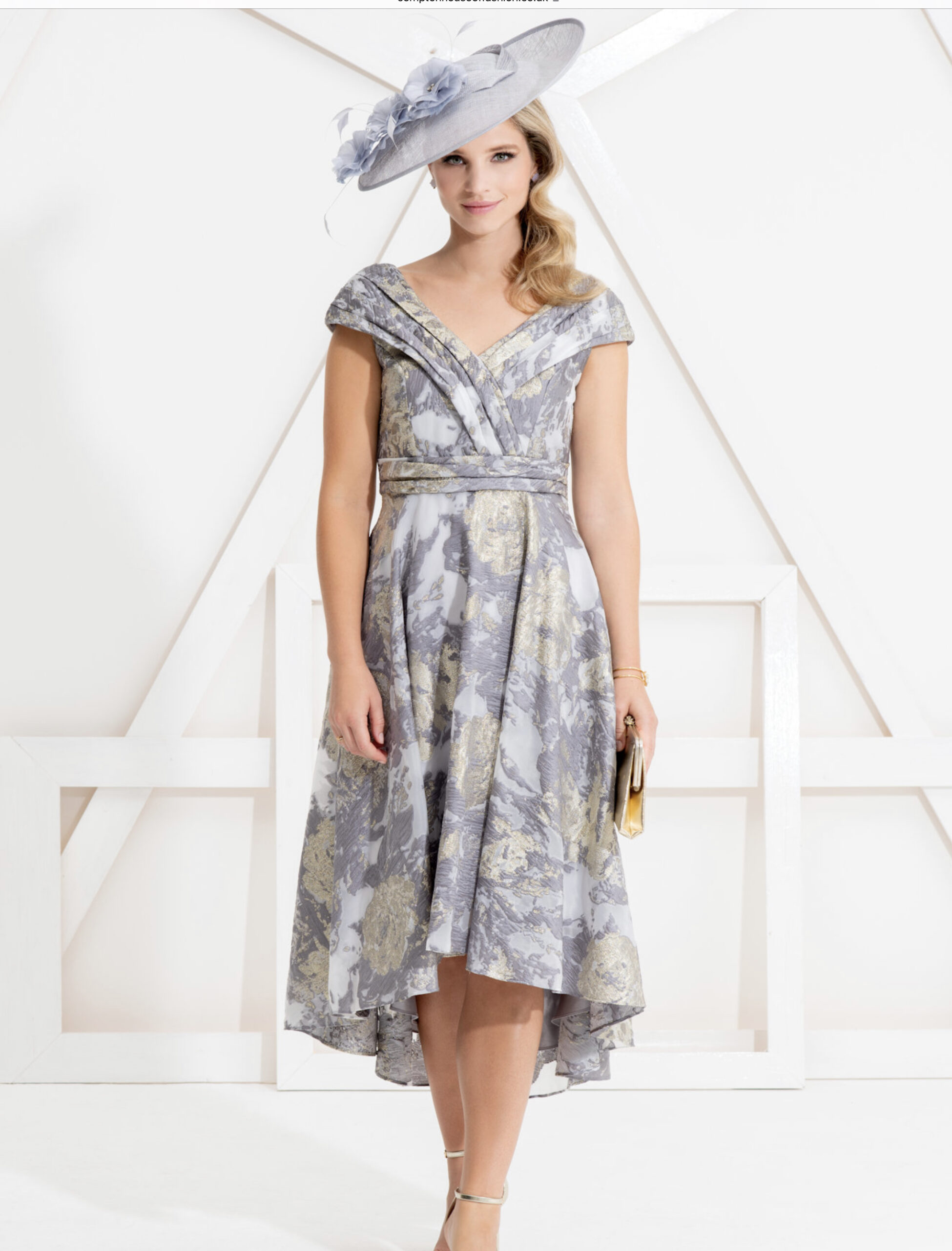 The Jacquard emboss print dress has a crossover ‘V’ neckline with a wide shoulder and semi capped sleeves.