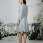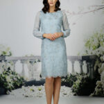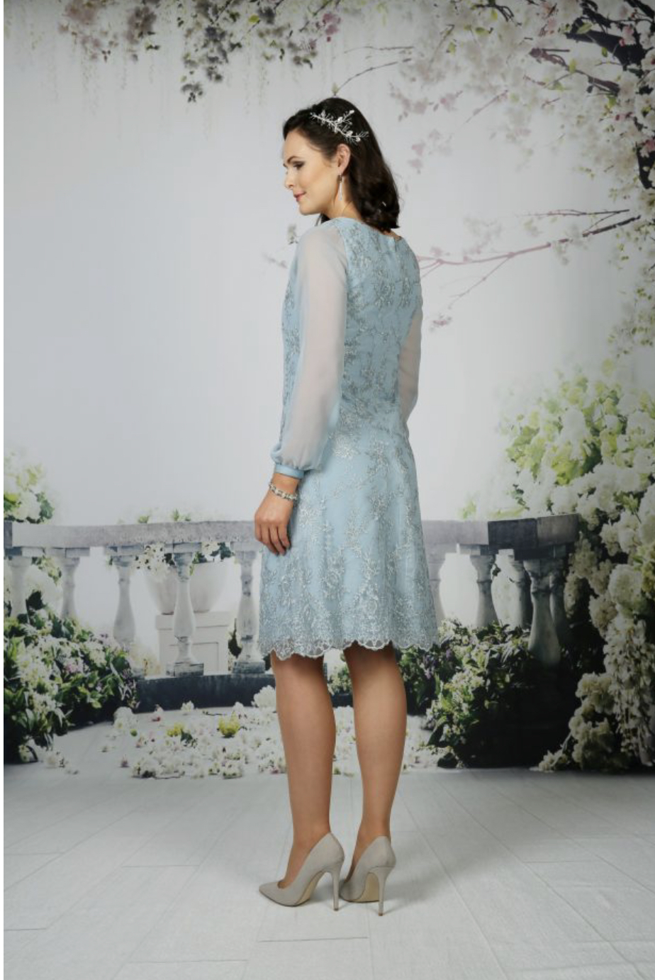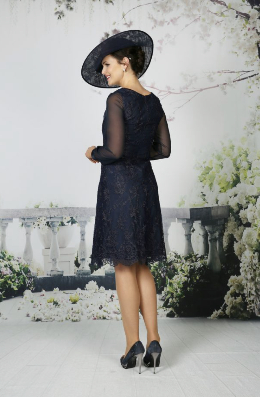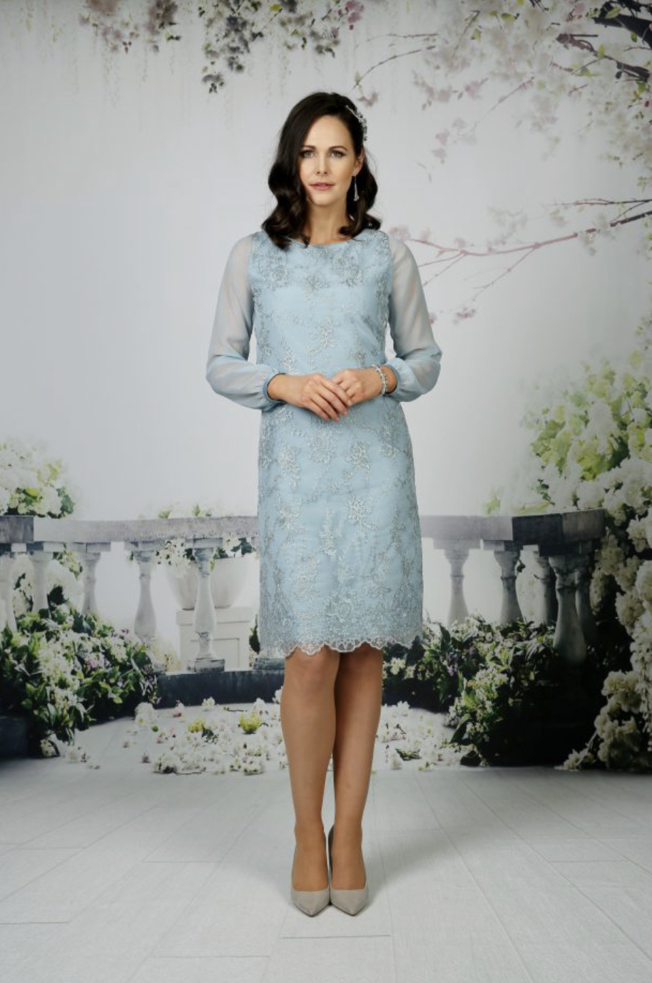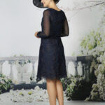 A soft lace dress with full chiffon sleeves and satin cuffs. Available in any chiffon colour, shown in Navy and Slate. Lace will always match chosen chiffon colour.