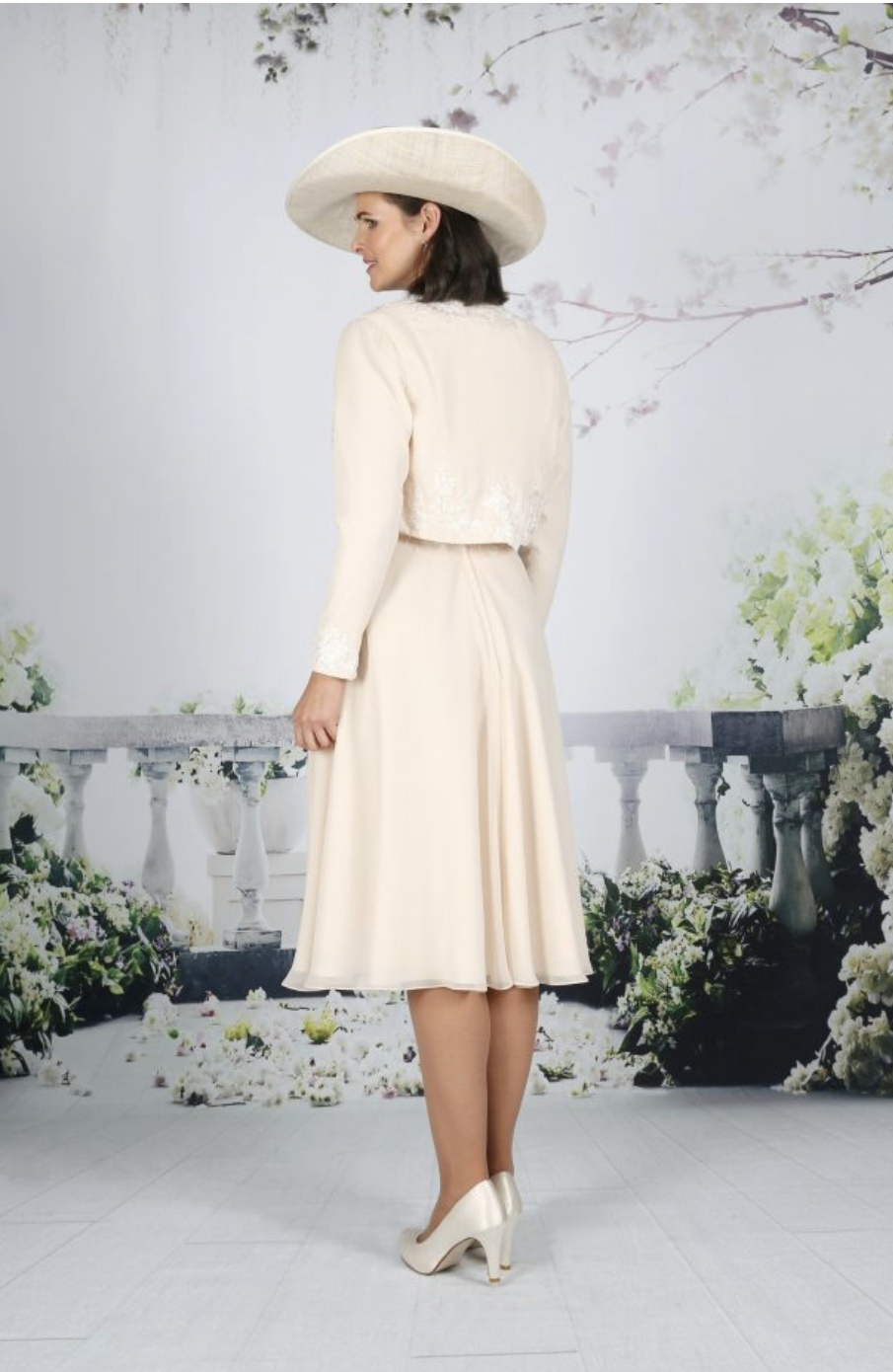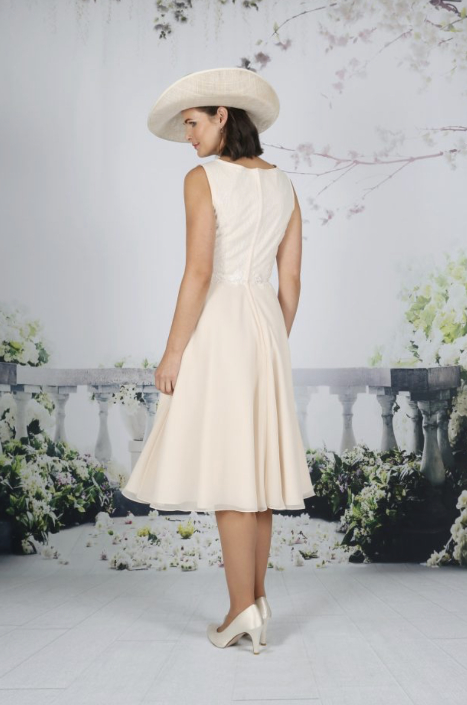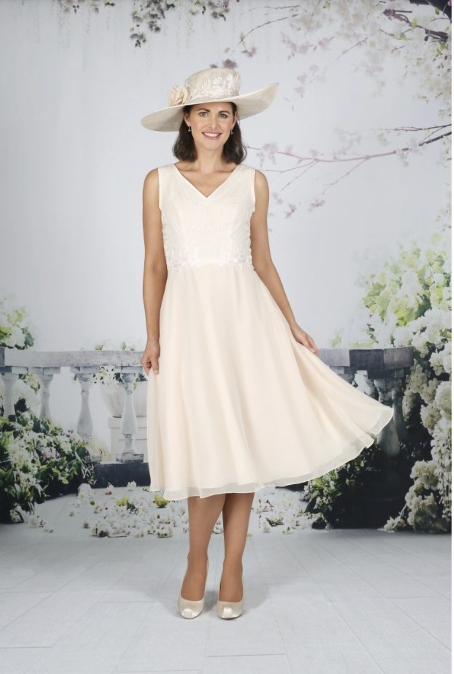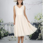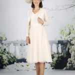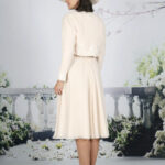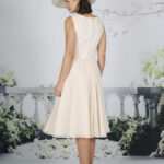 A fun yet sophisticated below the knee dress with a delicate glitter bodice and lace waistline. The elegant chiffon skirt is soft and swirly, perfect for dancing. Available in over 50 chiffon colours with Ivory lace. Chiffon and lace short jacket.