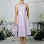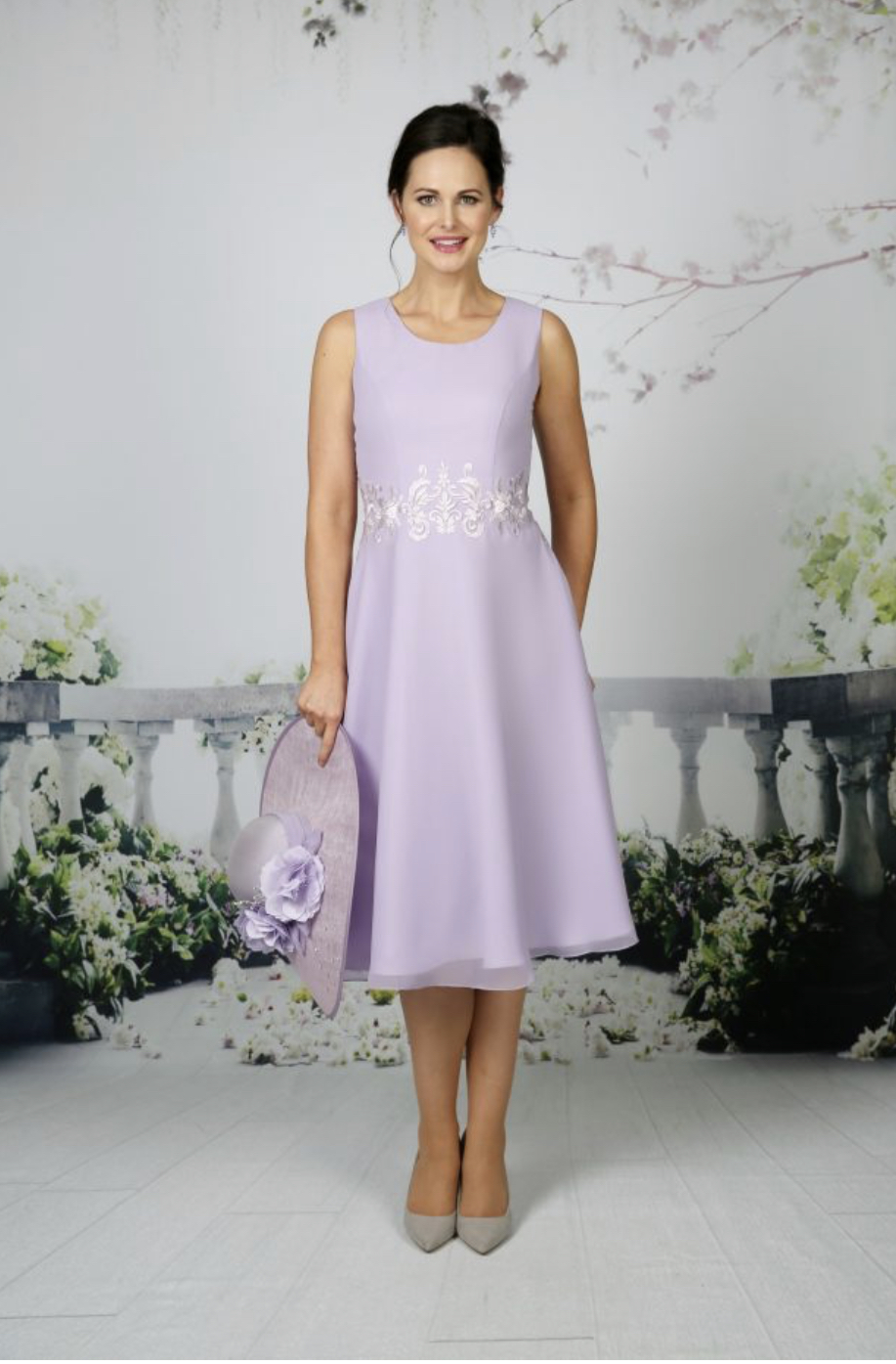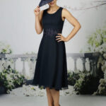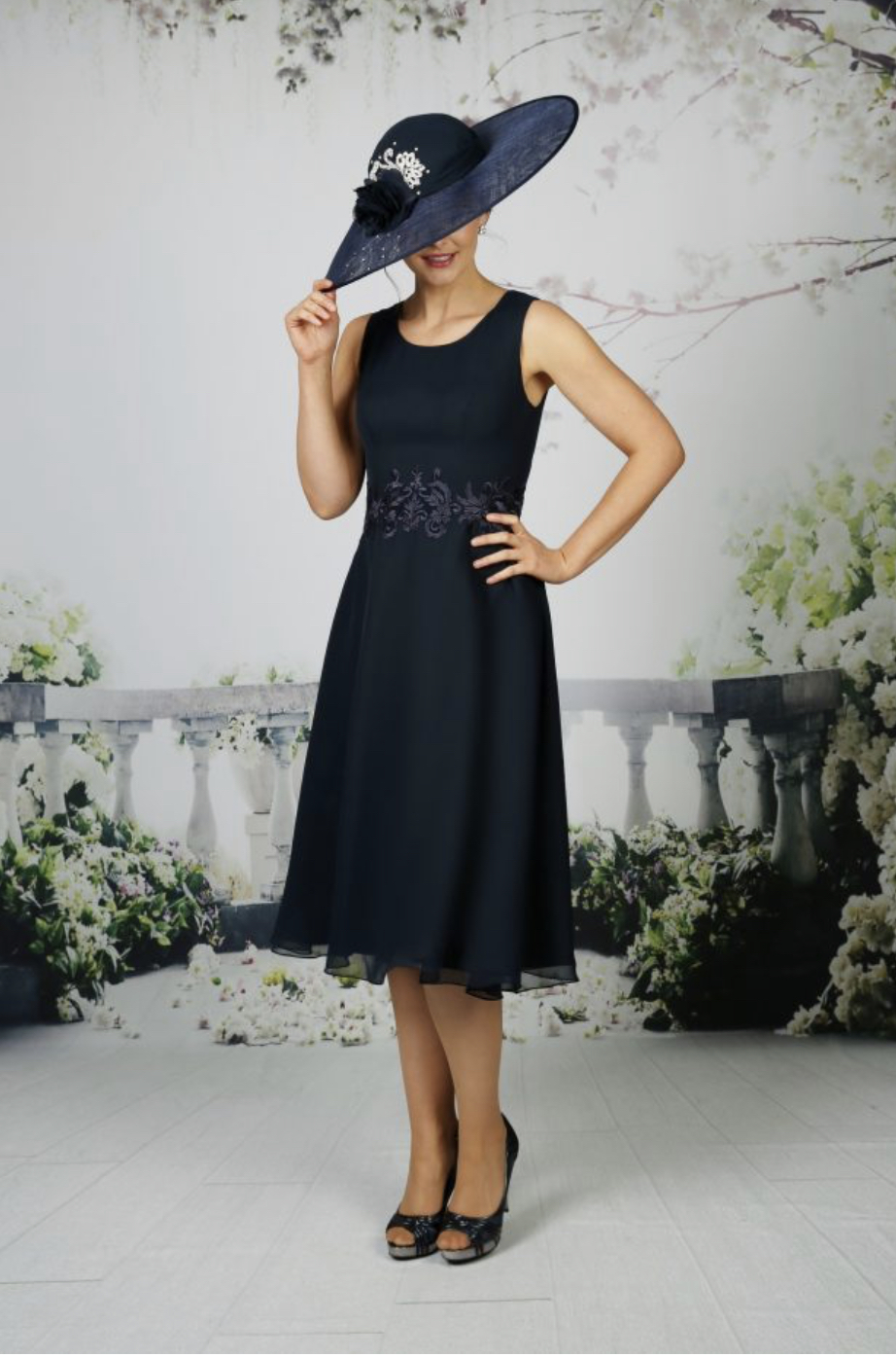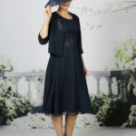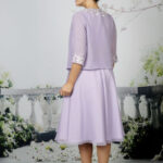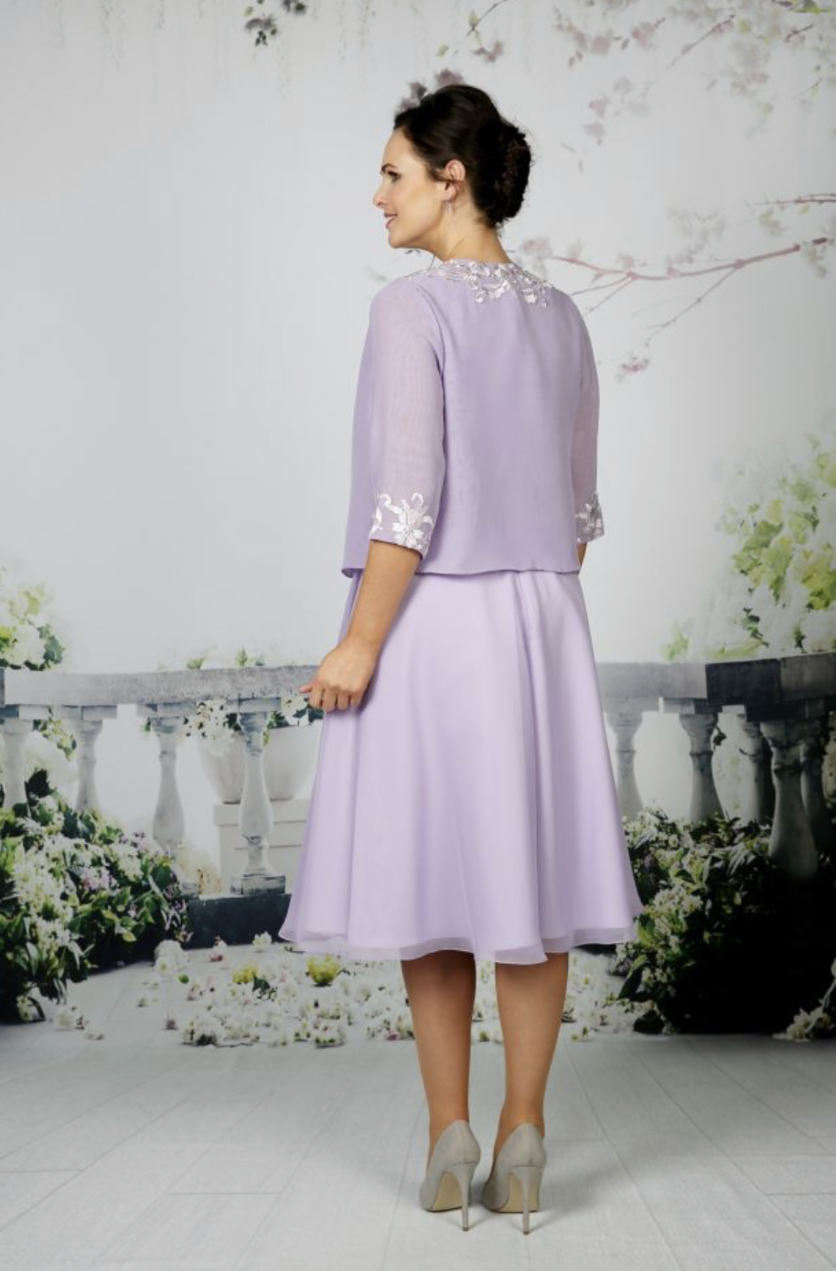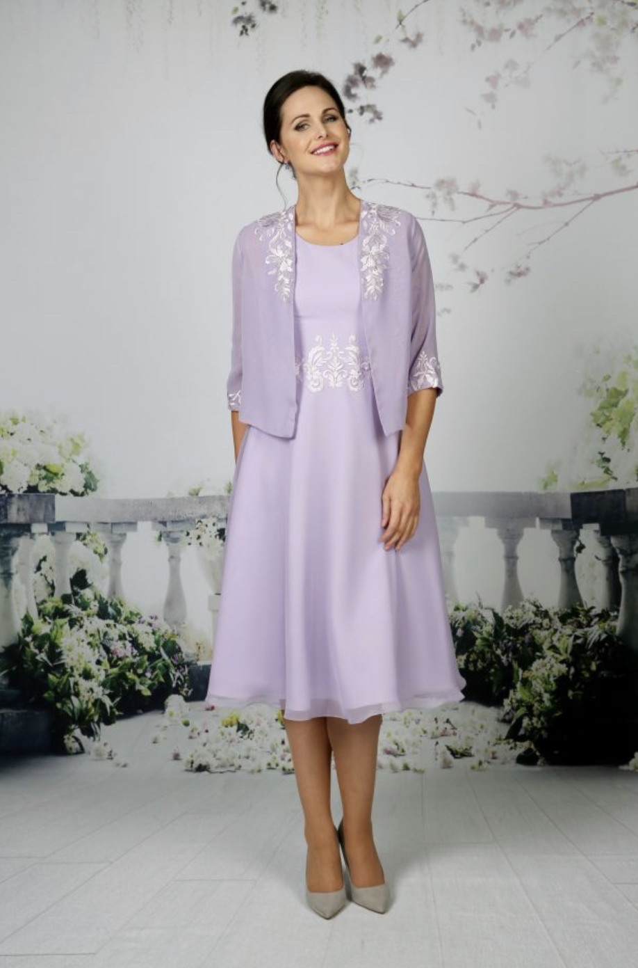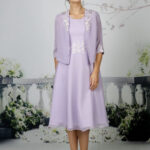 The softest chiffon dress with beautiful lace at the waist with A beautiful, soft chiffon jacket with 3/4 length sleeves complimented with satin lace. Available in over 50 chiffon colours, shown in Navy and Lilac.