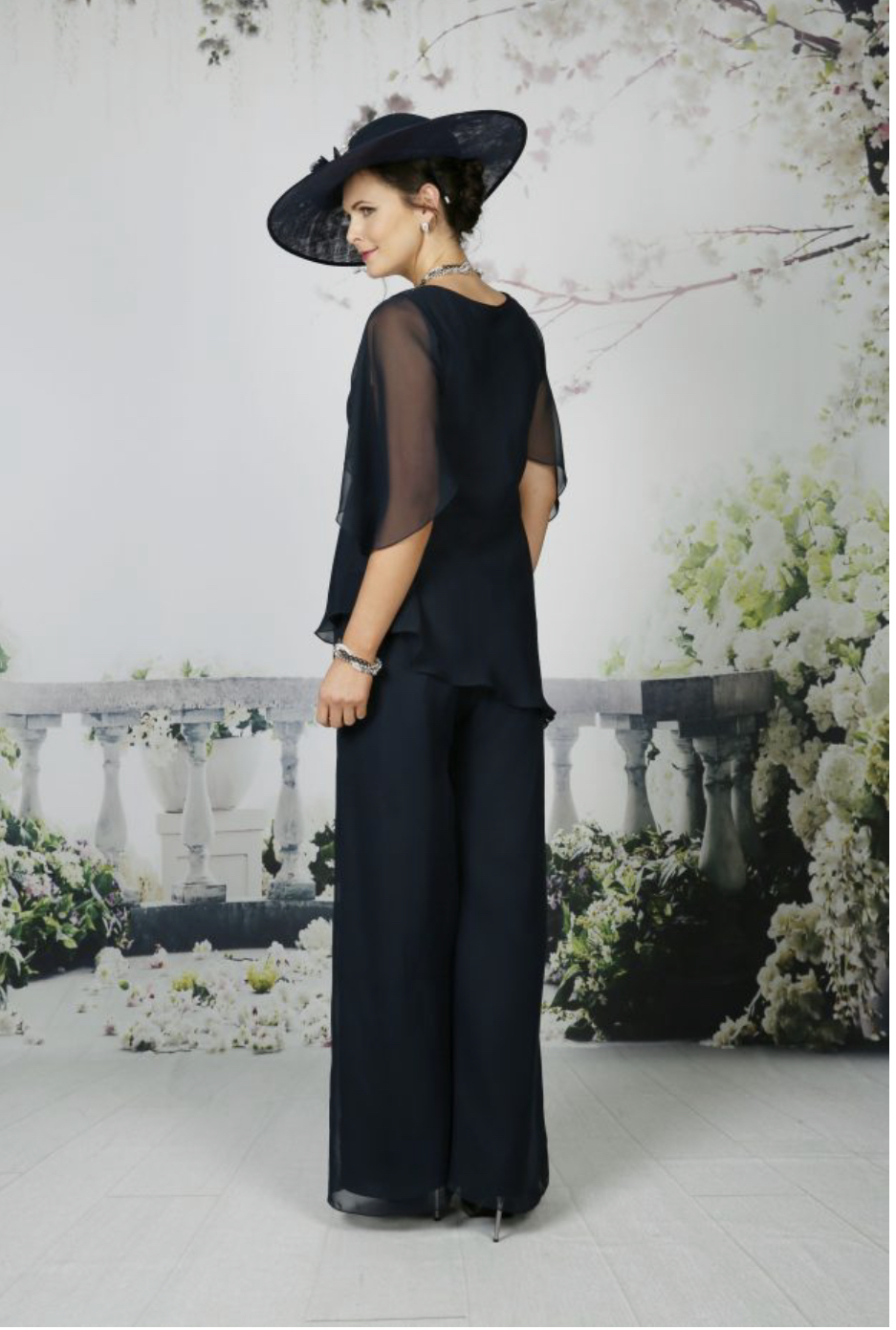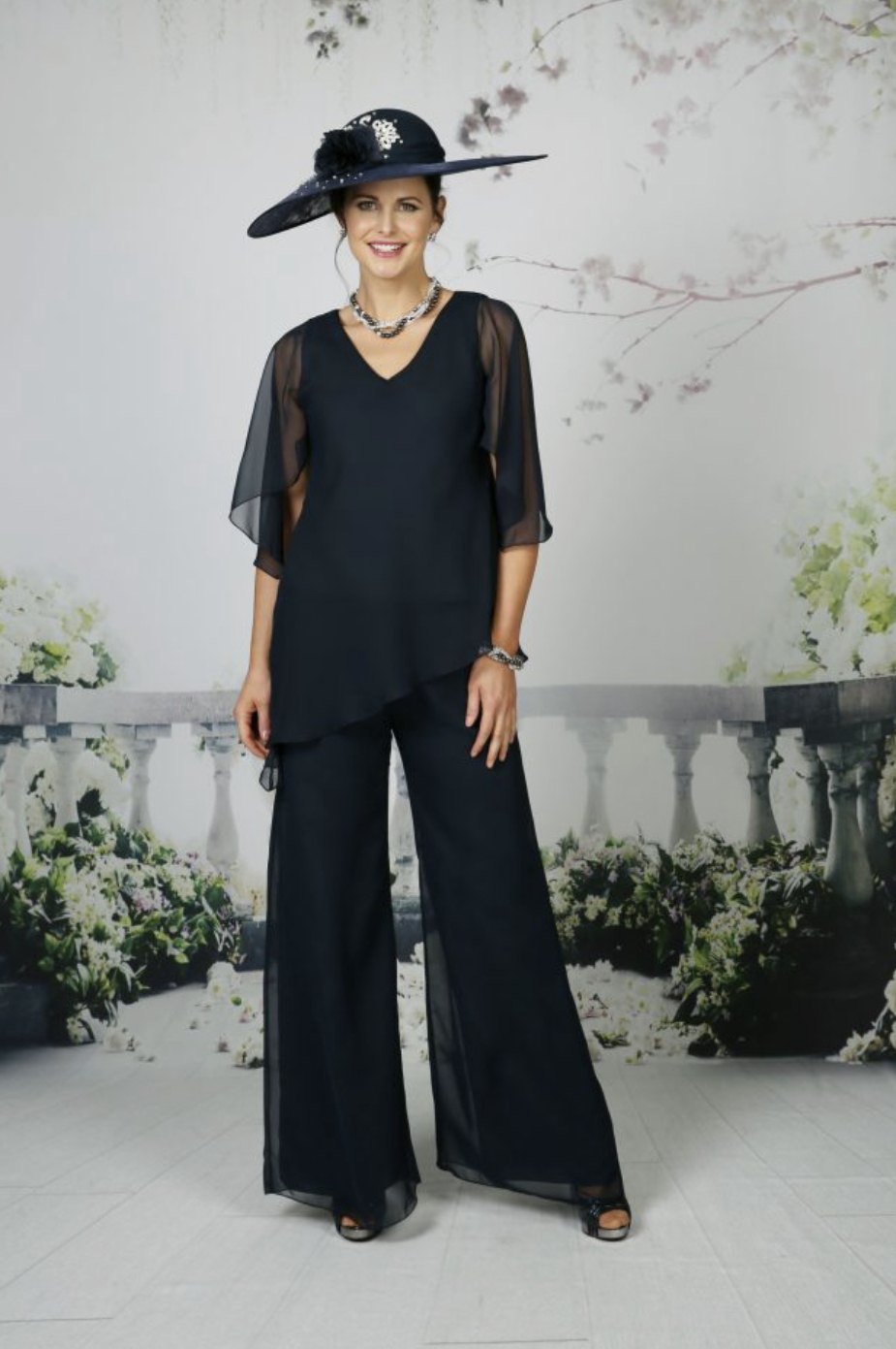 A gorgeous asymmetrical chiffon top with soft floating sleeves. Beautiful wide-leg chiffon trousers with an elastic waistband. Available in over 50 chiffon colours shown in Navy and Slate.