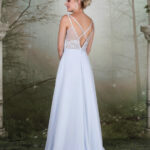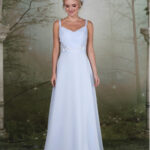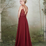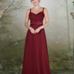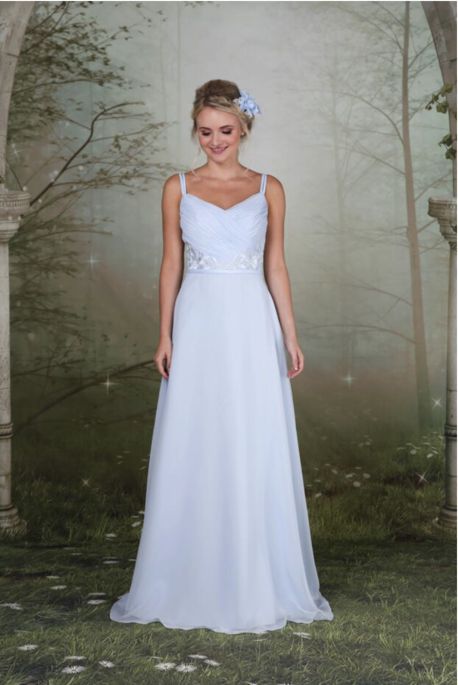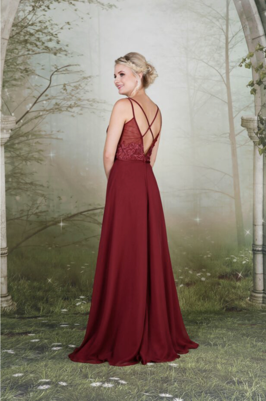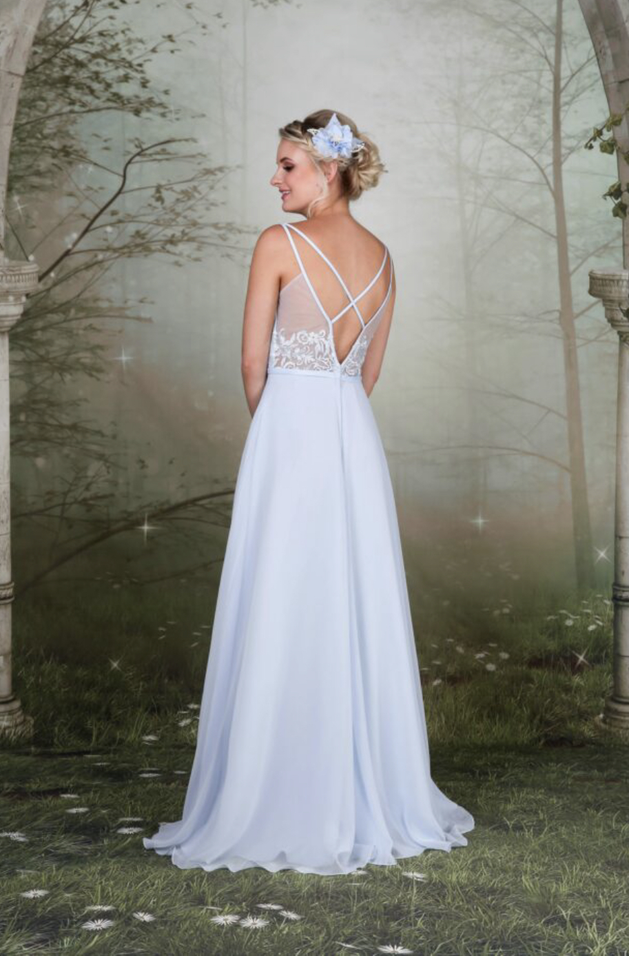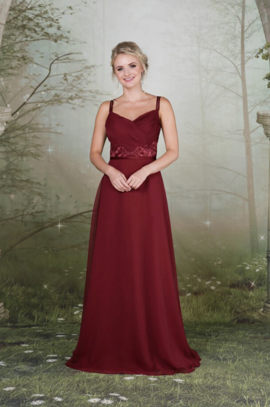A pretty pleated crossover bodice dress with satin finish lace appliques, leading to racer back crossover straps at the back. The satin finish appliques on the sheer tulle back give this dress a glamourous modern feel. Finished with a smooth chiffon A-line skirt and a narrow satin waistband. Fastened with a zip at the back. Available in any Chiffon colour. Lace appliques and satin waistband will match chosen Chiffon colour. Shown in Baby Blue and Burgundy.