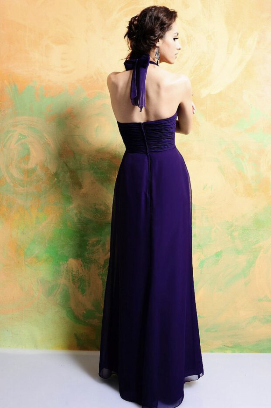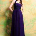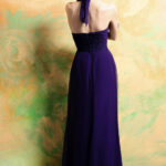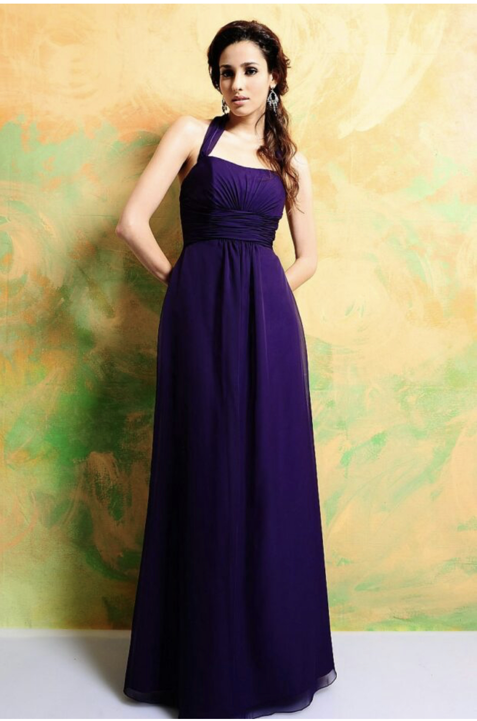 Classic floor length Chiffon gown featuring a ruched natural waist and softly gathered empire waist bodice. A self tying strap and softly gathered skirt finish the look. Fastened with a zip at the back. Available in over 50 Chiffon colours. Shown in Purple.