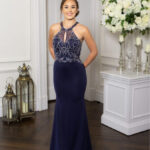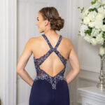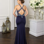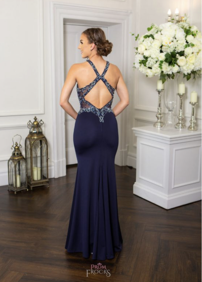Swirled with navy and silver beading, the illusion halter neck bodice has a keyhole front and open back with cross straps and low back. The beading flows down the centre back and side seams of the jersey fitted, fishtail skirt.