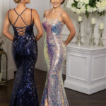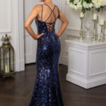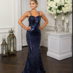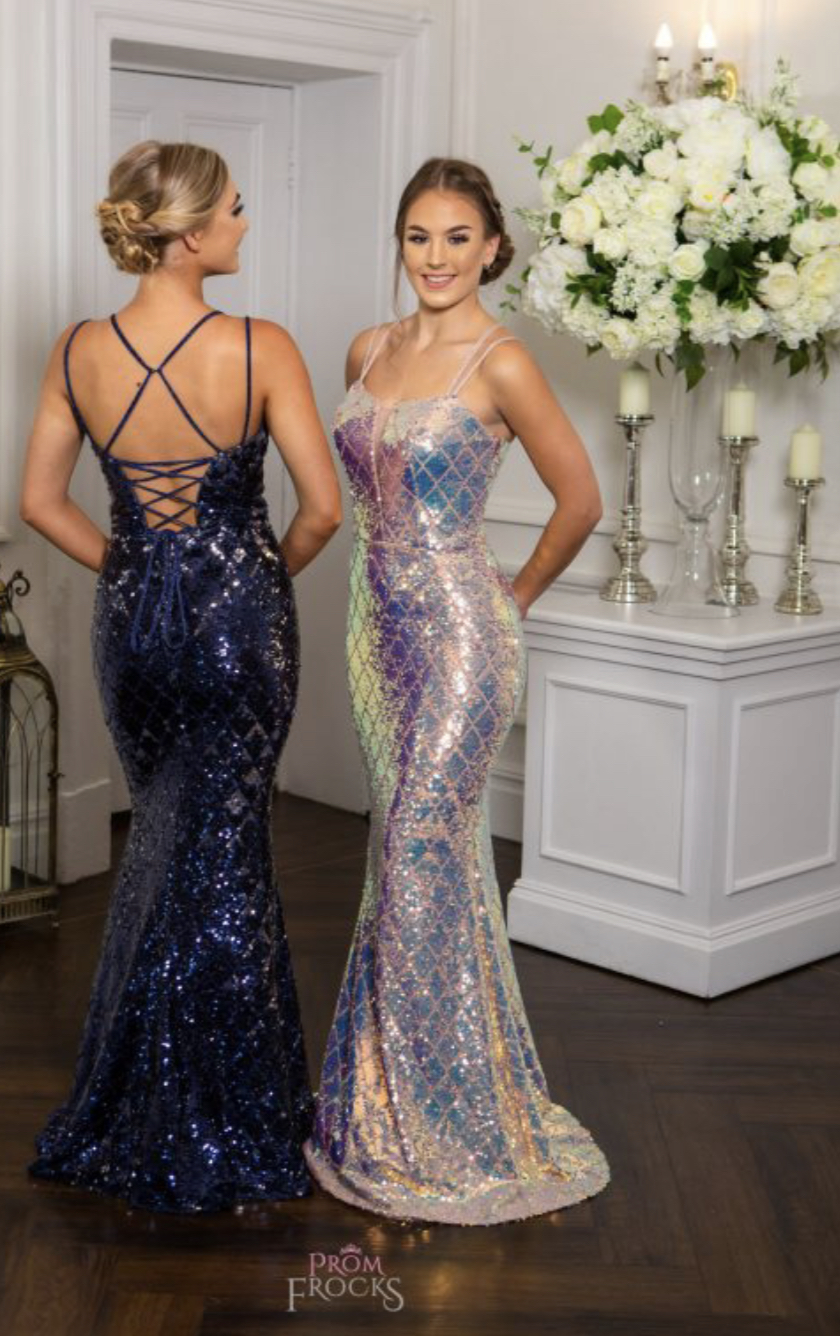 A star of the show in our full sequin gown, with two tone navy & silver sequins! The fitted fishtail shape shows off the colours reflected on the sequins. The front has a v-shaped inset, with metallic double shoulder straps crossing to the back, finished with a lace up fastening over an open back bodice.
