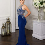 Our fitted jersey fishtail has an open back and illusion side panels with silver beading across the bodice cascading down the side seams. Fastening with a zip at the back, the skirt also has a small train.