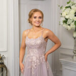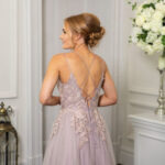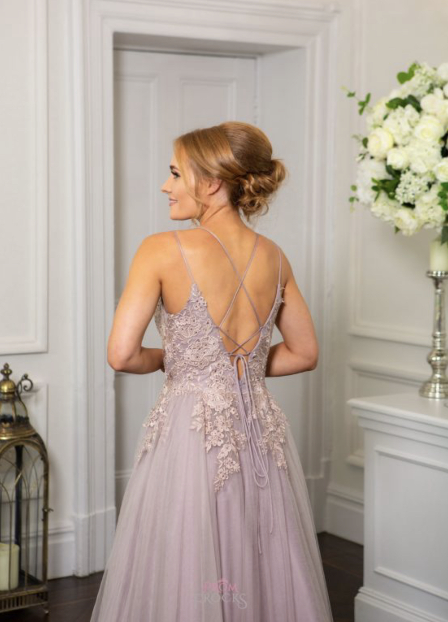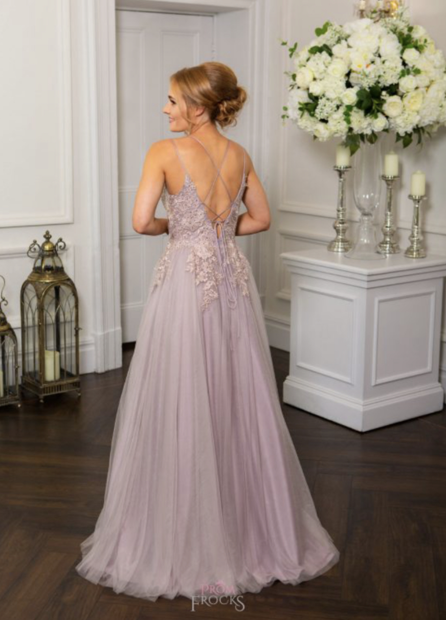 Our beautiful tulle ballgown with tonal embroidered motifs & beading layered onto the bodice. Spaghetti shoulder straps are doubled to form the lace-up back fastening, crossing over at the back bodice, to then tie into a bow.